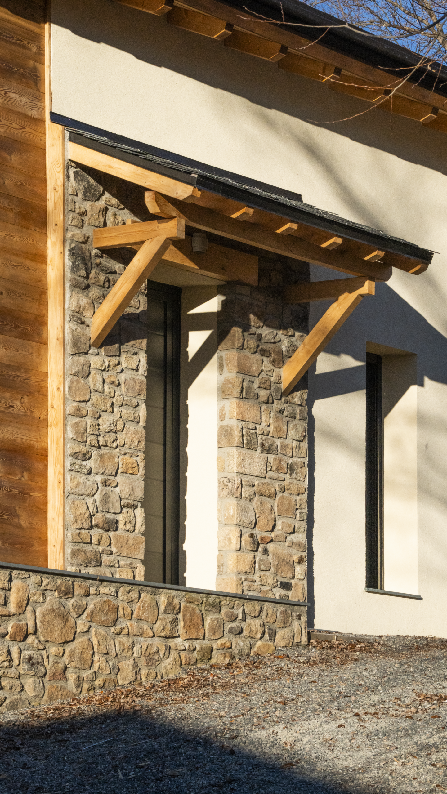 Une maison qui s’élève sur trois niveaux, avec un niveau bas abritant le garage et les locaux techniques. L’entrée piétonne se fait par le niveau supérieur où l’on entre dans la pièce à vivre et l’on découvre une double hauteur sous charpente apparente. Nous trouvons également deux chambres et une salle de bain à ce niveau. Enfin au dernier niveau, nous avons créer une mezzanine donnant sur la pièce à vivre, ainsi que deux nouvelles chambres avec salle d’eau. La construction est réalisé en maçonnerie. En façade nous avons travaillé un équilibre entre enduit, bois et pierre afin de mettre en valeur les éléments marquants extérieurs. L’entrée piétonne est protégée sous un porche et habillée en pierre.